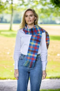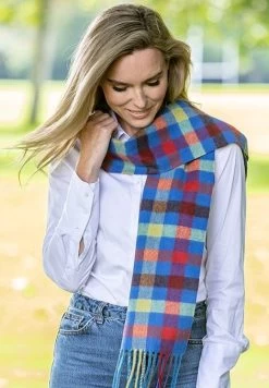 This lovely and luxurious cashmere scarf features a beautiful vibrant array of blue, red, and yellow. It pairs well with neutral colours, adding a bright pop to any outfit. It makes for a perfect accessory on a chilly autumn or spring evening so that you can stay warm.