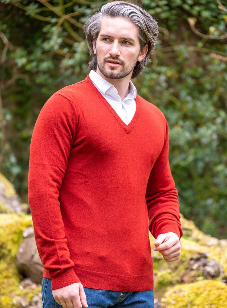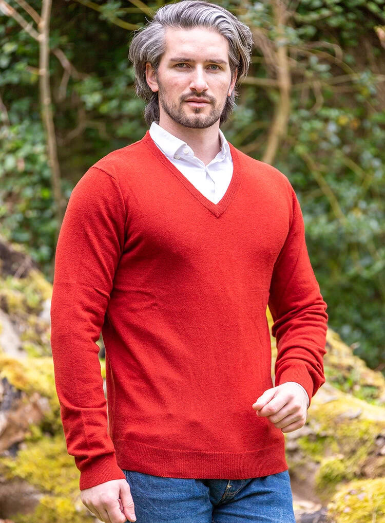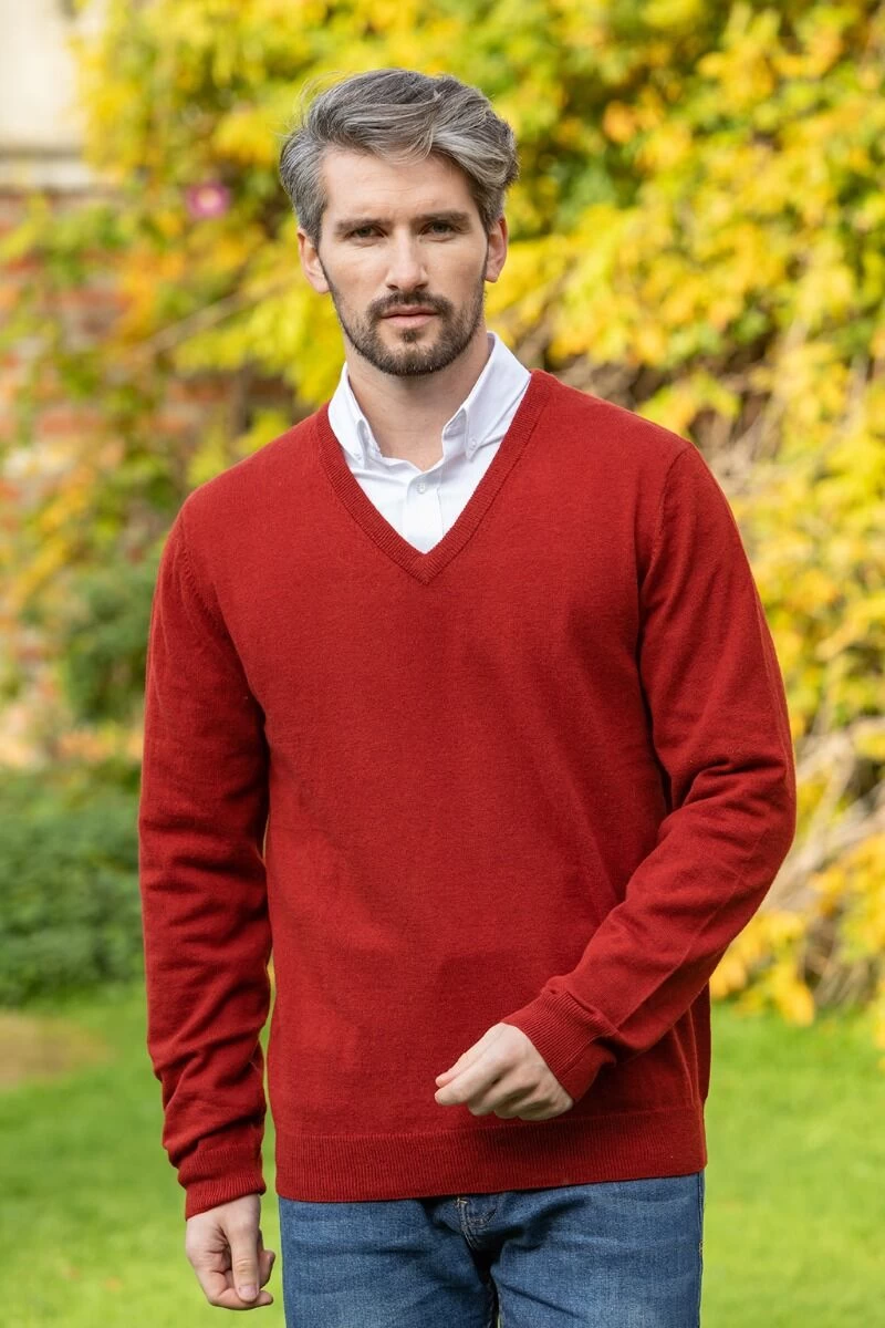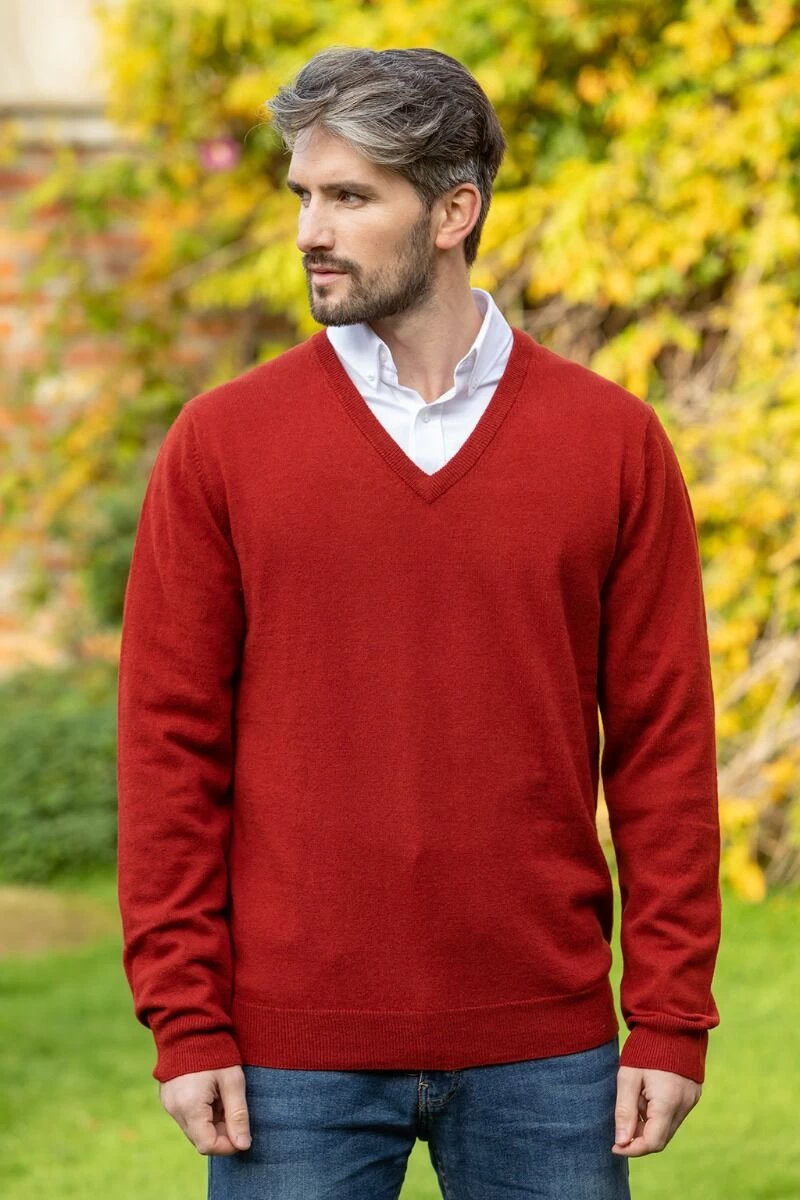 This mens lightweight V neck sweater is made of 100% lamsbwool. It is the ideal Summer sweater – it is elegant, sophisticated and fashionable. This Chilli colour is beautiful with blue jeans and your favourite shirt. It is a fitted sweater so runs slightly small. Model wears size large.