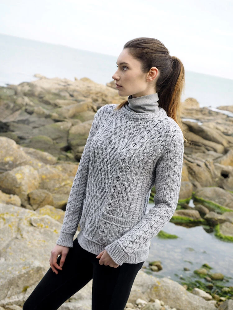 100% Merino Wool Sweater with front pockets. Cosy and Stylish, perfect for the winter weather! Available in both soft grey and natural, this Irish sweater features beautiful cable knit stitching, a lovely feminine necklin, and front pocket features!