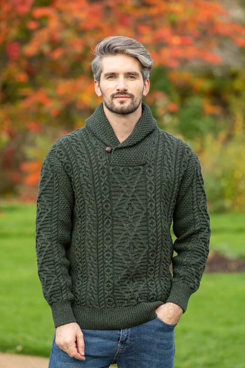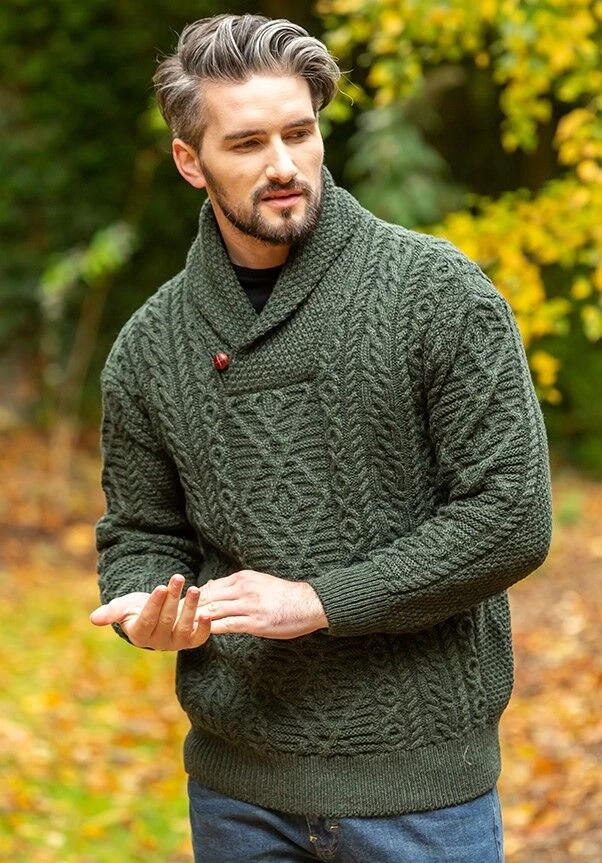 This trendy Aran shawl neck sweater, available in natural, green and navy, is made in Ireland and is 100% Soft Merino Wool. A true Aran sweater for the modern man, this piece is a wonderful addition to any man’s wardrobe. Cosy yet practical, this jumper would definitely make the perfect gift for the man in your life. A “V” neck shawl collar (or cowl neck) is the main feature of this Irish fisherman’s sweater – team it up with a shirt underneath or a polo neck for extra warmth!