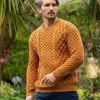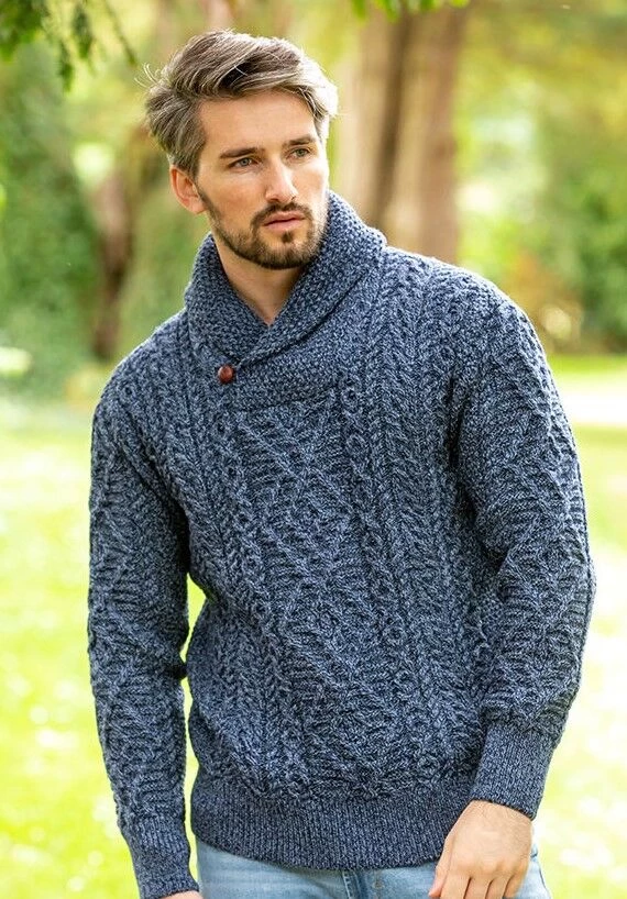 This Mens Irish Aran Shawl Neck is made of 100% merino wool. It has a range of stunning stitches throughout the front and back of this sweater. We absolutely love the shawl neck collar which will keep your neck toasty and cosy all year round. Team with one of our merino wool scarves to complete the look.