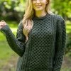 This ladies Irish aran cardigan is made in Dublin by fellow Irish family business Irelands Eye. It is made of the most luxurious yarn – 67% merino wool, 23% cotton, 5% silk and 5% cashmere. It is absolutely stunning on and is perfect for all seasons. It it a boxy oversized style so we suggest going a size down in this style.
