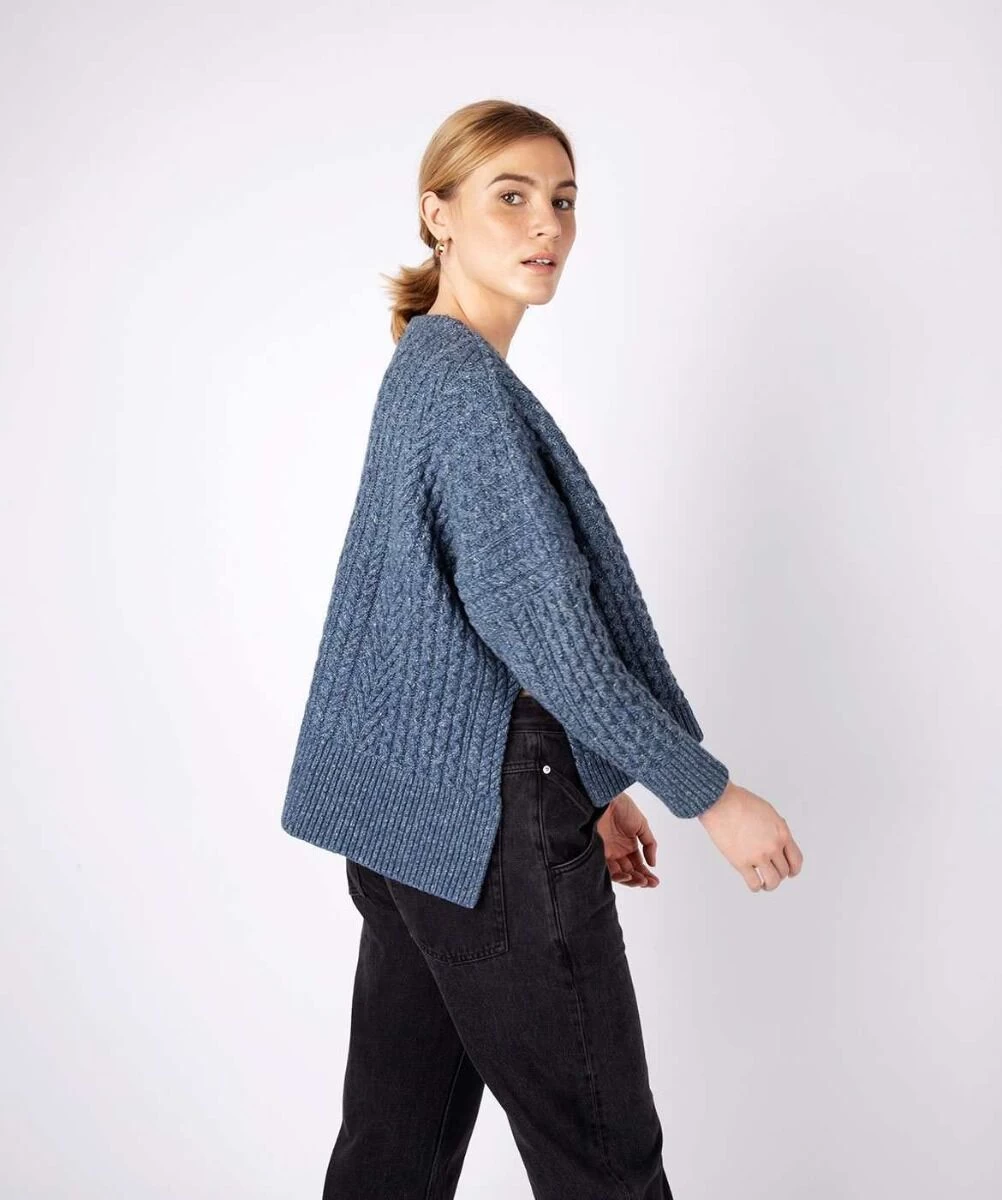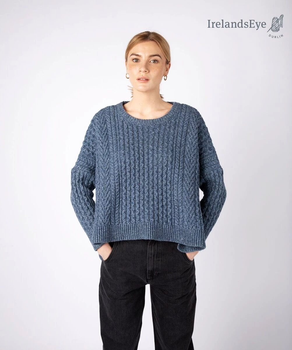 The Sorrel Aran Sweater is a long sleeve cropped crew neck sweater with an Aran pattern and side slits . This sweater is made from a blend of wool, cotton, cashmere and silk. Hand wash in lukewarm water, do not bleach, do not tumble dry, dry flat, reshape while damp, use a warm iron, and store folded in a cool, dry place. Founded in Dublin in 1988, IrelandsEye is a family-run company making knitwear for over 30 years. Inspired by the Irish landscape and the colours of nature, they combine a traditional Irish knitwear heritage with their own unique twist. Designed and made in Dublin, each piece is crafted using 100% natural yarn, carefully finished by hand.