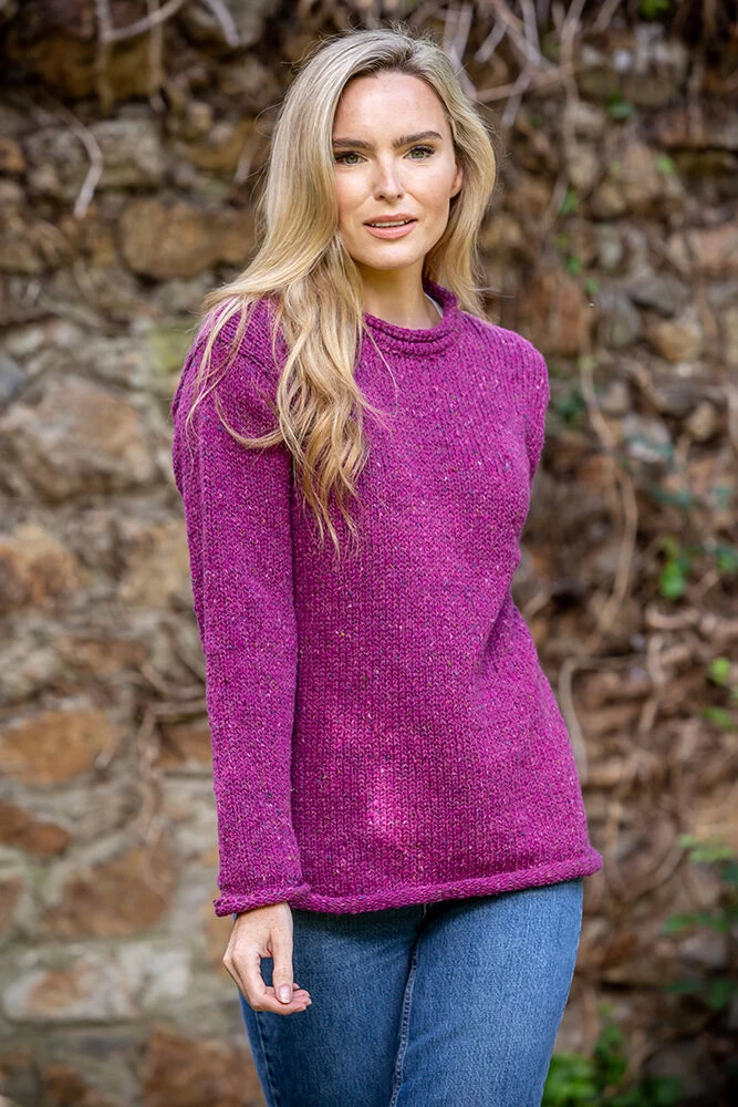 This ladies Roll Neck sweater is hand loomed in Donegal in Ireland. It is made of 100% Donegal Wool. It is available in a variety of stylish colours – 3 versatile colours give you the option to pick your dream Irish sweater. It is so comfortable and warm to wear, you will never want to take it off! It features a classic Roll neck and slightly curved sleeves giving it a classic finish to this timeless, stylish Irish sweater. Available in sizes XS to XL, this is a sweater that will suit everyone. It is a superb Donegal hand loomed Aran sweater. This stylish hand loomed jumper, available in turquoise fleck, pink fleck and green fleck, is made in Ireland of 100% Donegal Wool. It is a very stylish yet comfortable to wear and is a great Christmas gift for any woman this winter!