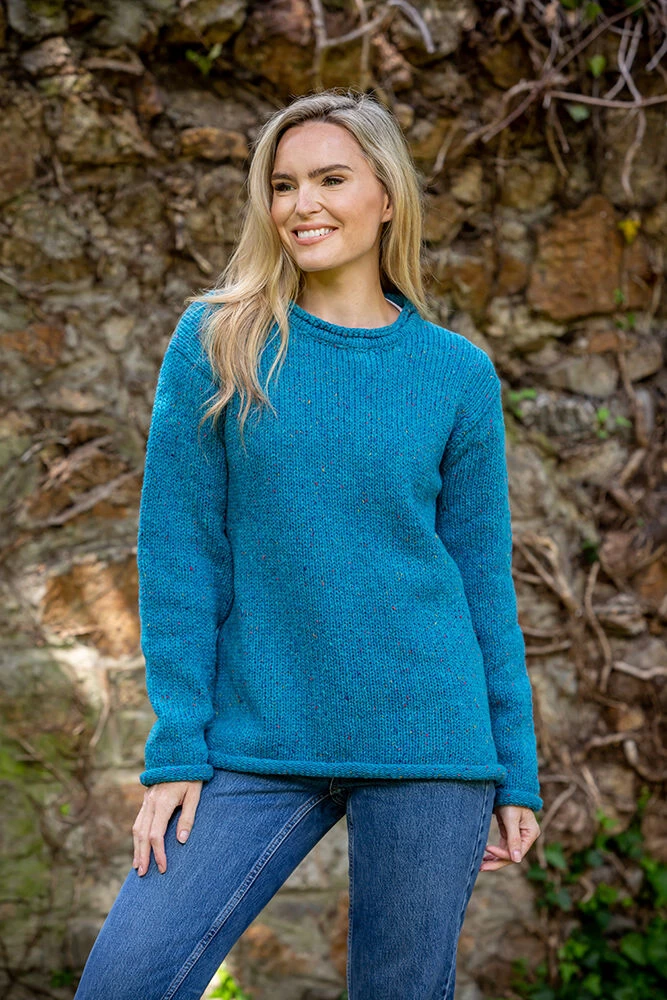 This ladies Roll Neck sweater is hand loomed in Donegal in Ireland. It is made of 100% Donegal Wool. It is available in a variety of stylish colours – 3 versatile colours give you the option to pick your dream Irish sweater. It is so comfortable and warm to wear, you will never want to take it off!