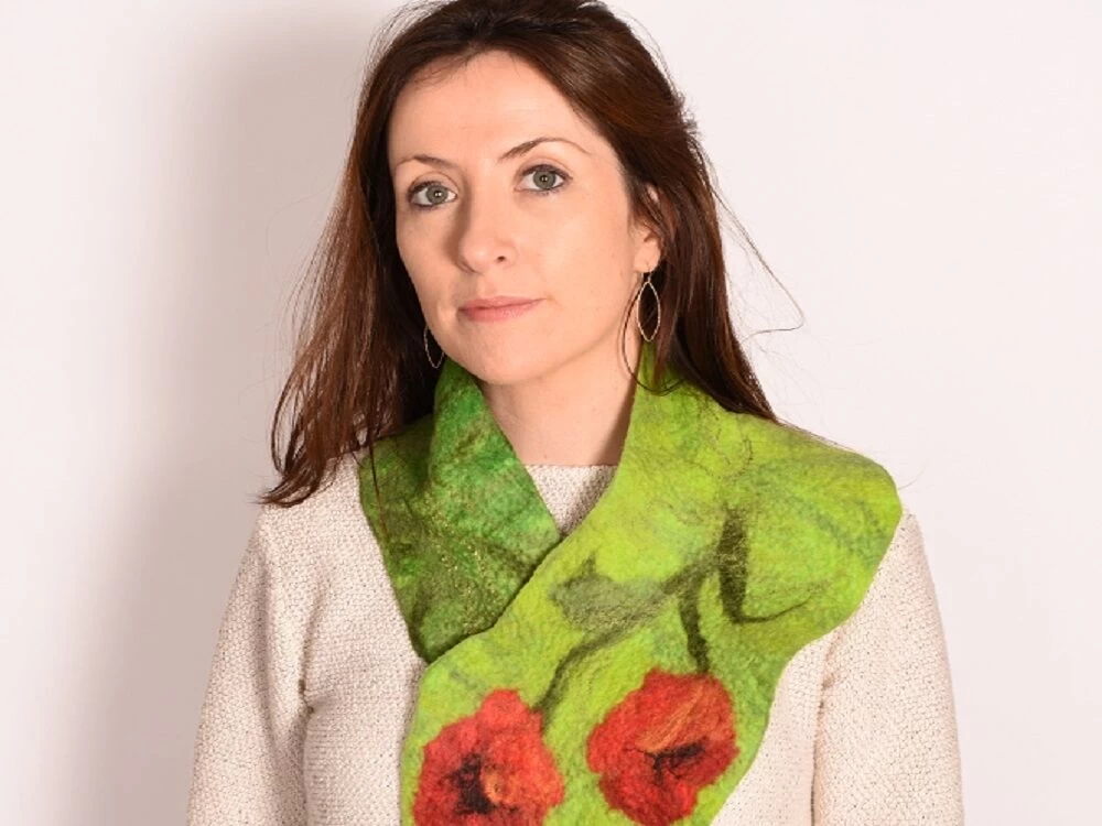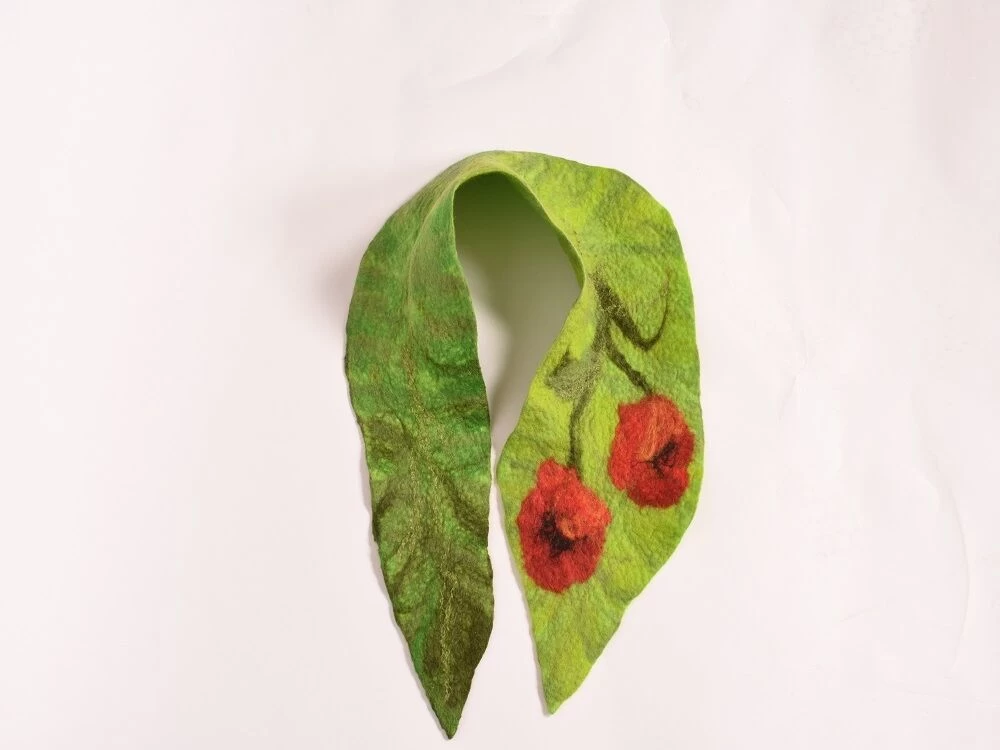 Felt out of soft merino wool in a myriad of shades. This beautiful leaf style scarf is hand made exclusively in-store and is one of a kind. Please ask for custom made commissions.