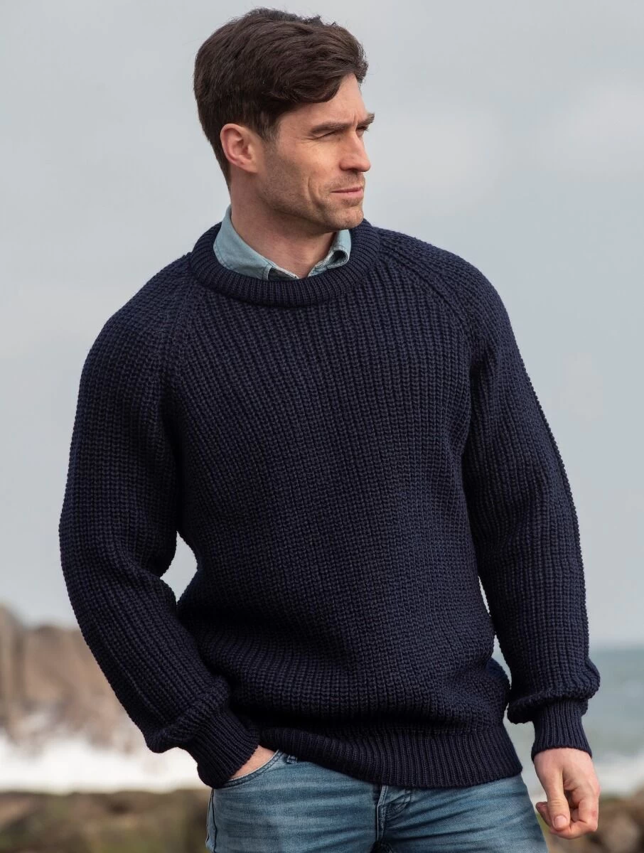 The fisherman’s rib wool sweater is knitted using the traditional rib stitch. The rib is knitted using a large stitch pattern and therefore this garment is exceptionally warm. This wool sweater in the past, was worn by fishermen while out on the rough seas.