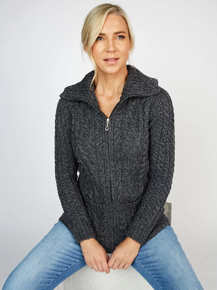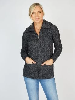 This ladies Irish Aran cardigan is made of 100% merino wool. It is a fitted style so will keep you nice and cosy. It is a beautiful shade of grey so makes this cardigan very flattering on. The Irish stitches can be seen clearly throughout this cardigan which makes it so interesting.