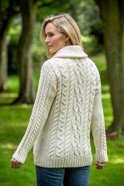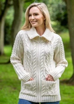 This stunning 100% merino wool cardigan features a variety of aran stitching throughout the front and back of garment. It is fitted in shape so is modern and stylish – it will keep you warm and trendy this winter! Deep pockets feature for convenience. Available in a variety of colours, this is a must have this year.