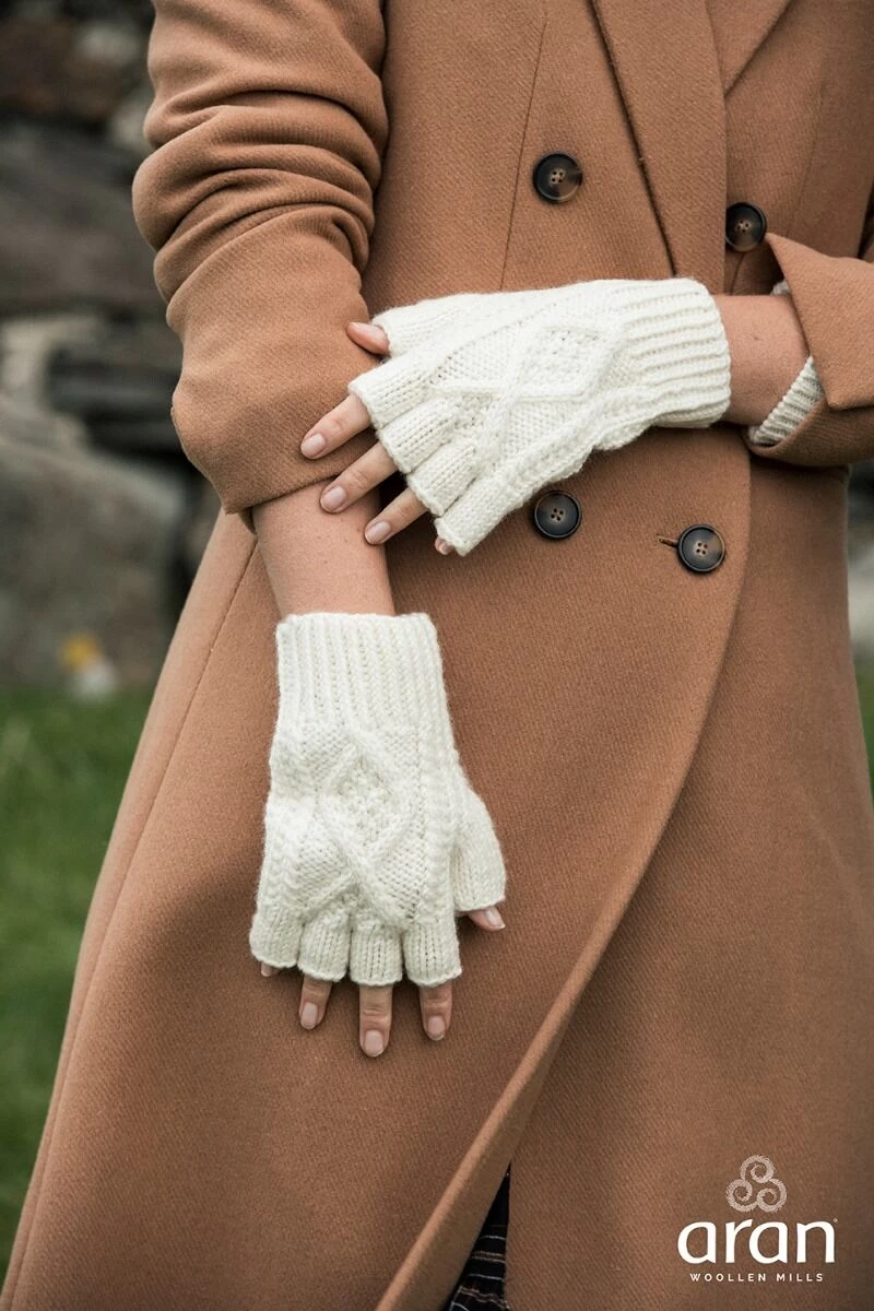 These stylish fingerless gloves will keep you warm on those cold winter days, allowing you to easily operate phones, cameras and other small devices. Hand-knit with 100% Merino Wool, they contain traditional diamond Aran stitching. Rib-knit cuffs seal in warmth and provide a great fit. Made of 100% Soft Merino Wool Made in Ireland. These aran gloves are one of the best sellers in our aran accessories range. Delivery time 2-10 working days (Irish Post) Got a question? Ask us at [email protected]