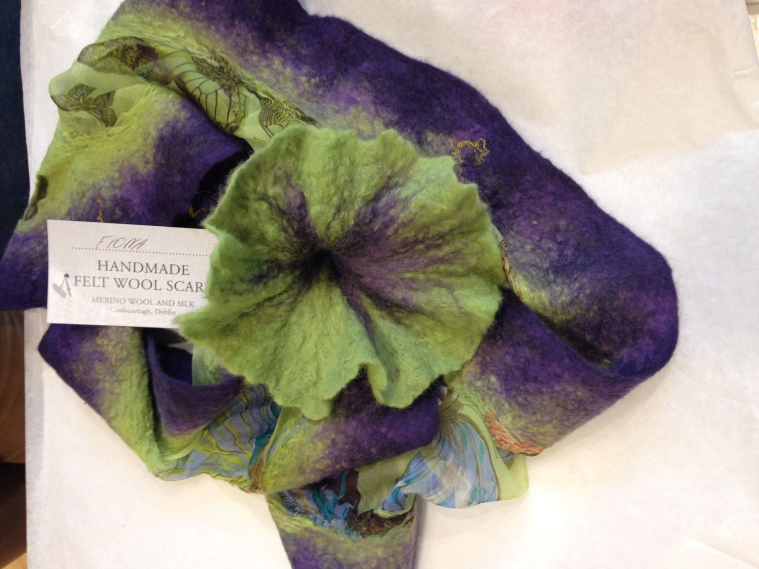 This gorgeous felt wool scarf features a multicolored flower in a myriad of shades available. These are hand made exclusively in-store, making each scarf unique. If you are interested in a custom-made commission, please ask. As these scarves are made of wool felt they are highly resilient and will last you for decades.