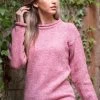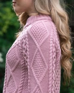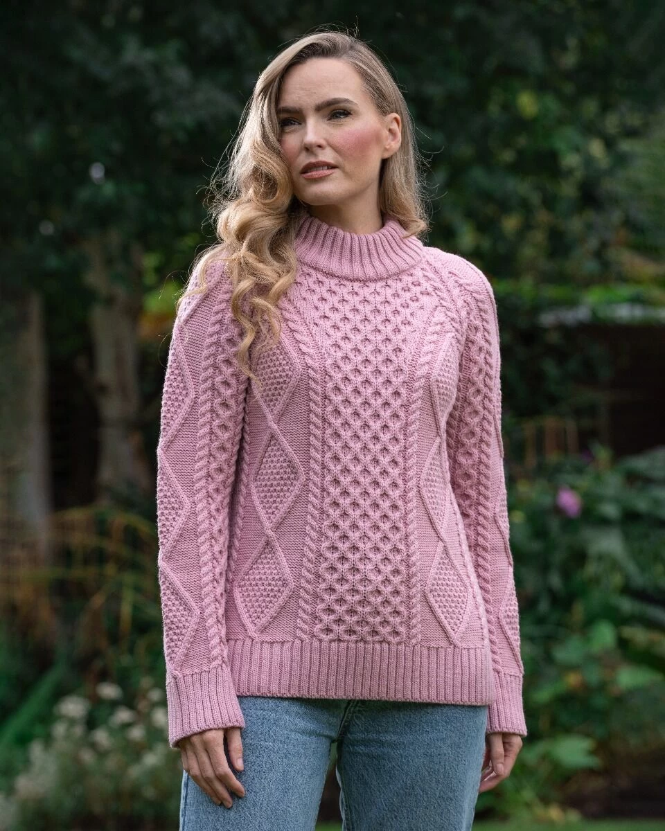 NEW IN! A must have this Autumn Winter, is our new high neck chunky aran sweater! It is made of 100% merino wool and is slightly chunky in style, making it cosy, fashionable and practical. The colour pink makes each and every stitch pop and will be sure to keep heads turning. Exclusive to The Sweater Shop. Wear with blue jeans and your favourite Irish scarf to complete the look.