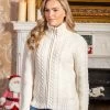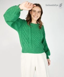 This 100% Merino wool style is a cropped, crew neck Aran with generous sleeves and an Aran pattern of gentle moss, honeycomb and cable stitches