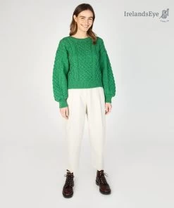 This 100% Merino wool style is a cropped, crew neck Aran with generous sleeves and an Aran pattern of gentle moss, honeycomb and cable stitches