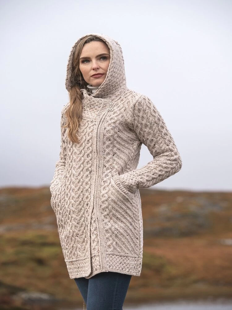 This ladies Irish aran full zip hooded cardigan is made in Ireland of 100% Merino wool. Featuring a stylish side zip, this long aran cardigan is the perfect replacement for your coat! Featuring Celtic knot on the zipper and an array on intricate Irish stitches throughout, this Aran cardigan is must have this Winter!
