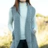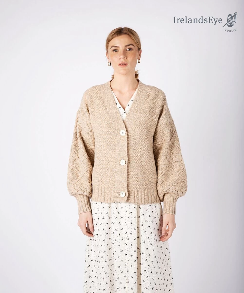 The Thistle Cardigan features a gentle moss and cable pattern stitch and statement cable lantern sleeves. This cardigan is made from a blend of merino wool (67%), cotton((23%), cashmere (5%) and silk (5%). Hand wash in lukewarm water, do not bleach, do not tumble dry, dry flat, reshape while damp, use a warm iron, and store folded in a cool, dry place. Founded in Dublin in 1988, IrelandsEye Knitwear is a family-run company making knitwear for over 30 years. Inspired by the Irish landscape and the colours of nature, they combine a traditional Irish knitwear heritage with their own unique twist. Designed and made in Dublin, each piece is crafted using 100% natural yarn, carefully finished by hand.