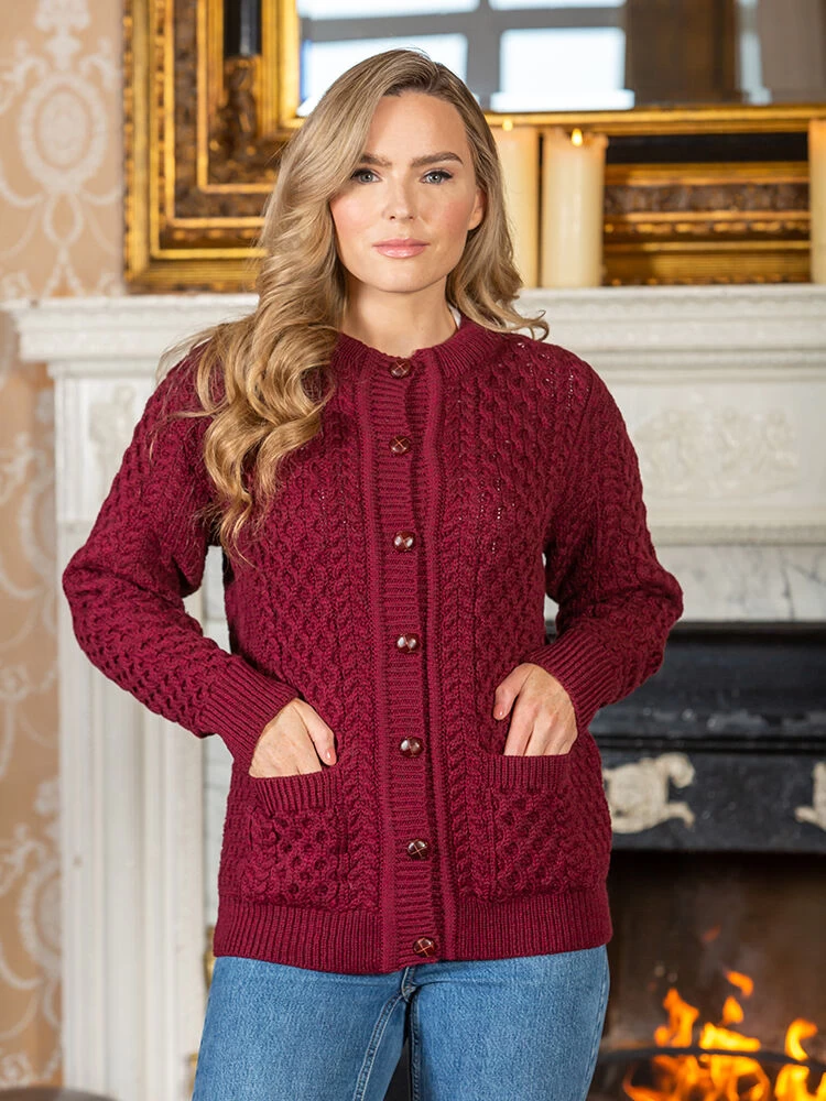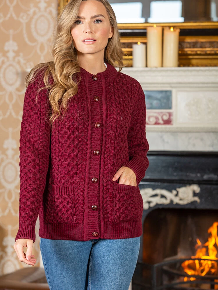 This Irish Aran Cardigan is a true classic! It is made of 100% merino wool. It features stunning cable knit Irish stitches throughout and haspractical and functional front pockets. It is so warm and cosy, the perfect cardigan for your Winter wardrobe. Wear with your favourite jeans, boots and one of our aran wool scarves to keep yourself look stylish yet warm this Winter.