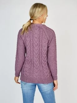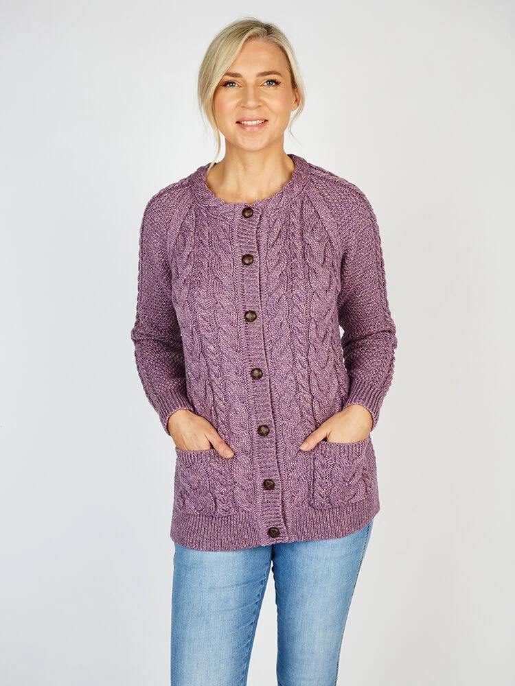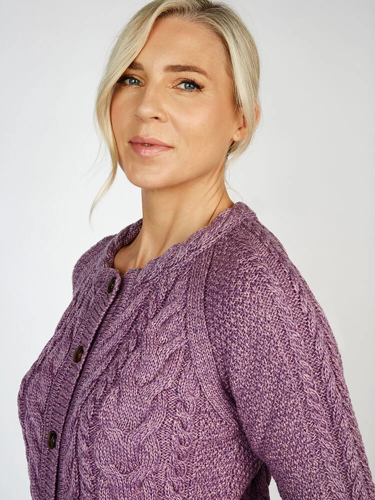 This Irish aran cardigan lumber is made of 100% merino wool. It is a classic cardigan that never goes out of fashion. It has practical and functional pockets at the front and an array of gorgeous Irish stitches throughout. We love the detail in this cardigan in this beautiful new lavender colour. The beautiful soft yarn on this sweater makes it exra cosy and luxurious. This is the perfect addition to your wardrobe this Winter. Wear with your blue jeans and one of our merino wool scarves to complete your look.