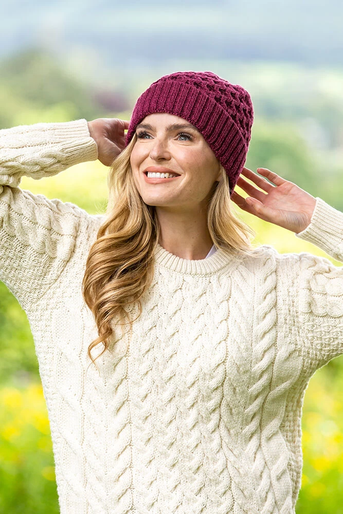 This traditional knitted Irish Aran hat is made from Merino wool and comes in a lovely selection of colors. It features a beautiful cable knit pattern on top with a comfortable ribbed trim. This hat is nice and lightweight, making it a great accessory for a cool autumn or spring day. Makes a great gift or souvenir! Matching scarves are also avaiable for a beautiful Irish aran hat and scarf set.