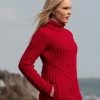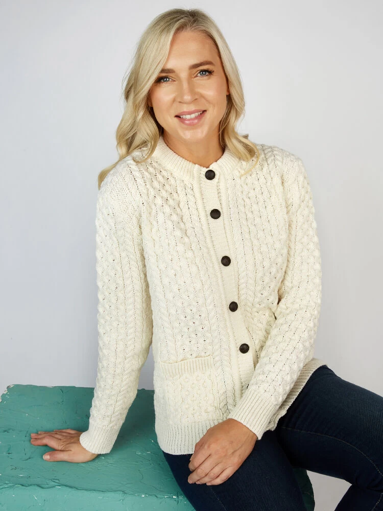 This Irish Aran wool Lumber is made of 100% Merino Wool. It features delicate buttons down the middle of the cardigan to allow you to wear buttoned up or open over a shirt. This cardigan reflects the ease and “cool elegance” of a ladies wardrobe. This sweater is knitted from warm and cozy Merino Wool so it can be worn all year around as merino wool will keep you snug in the winter and cool in the summer! It looks great with skinny jeans, leather trousers or leggings for a casual day. We can see the stunning Irish Aran cable knit stitches on the front and on the back of this cardigan. This is the traditional style Irish Aran Lumber jacket that oozes style and sophistication. We love the fashionable high rounded neck line on this wool jacket. This wool cardigan comes in a variety of stunning colours and is available from sizes Small to Extra Large. It is important to remember to hand wash this wool cardigan and lay it out flat to dry.