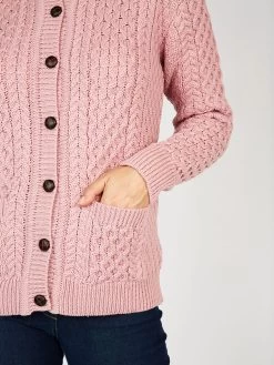 This Irish Aran Cardigan is made of 100% merino wool. It is a beautiful shade of Rose, making it a stand out cardigan. Featuring Irish Aran stitches throughout the cardigan, this classic style will never go out of fashion. It has practical and functional front pockets, it is a cardigan that will last a lifetime. Wear with one of our aran scarves to complete your cosy look.