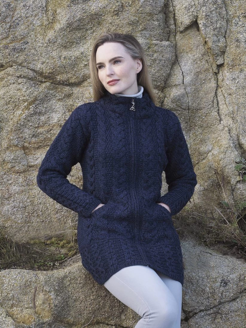 This 100% merino wool ladies full zip 3/4 length cardigan is made in Kildare, Ireland. The insert pockets are functional and practical and the full zip feature allows you to layer this cardigan.