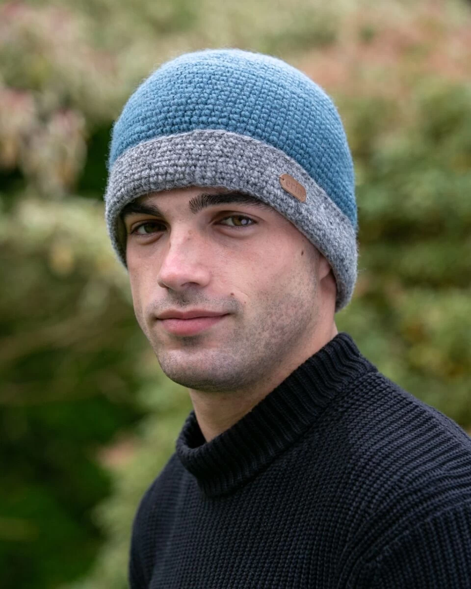 Our stunning mens turn up crochet hat in a bight denim blue. This beautiful Irish hat comes with fleece lining for extra warmth and comfort. Available in a selection of bright spring colours it is sure to brighten up any outfit.