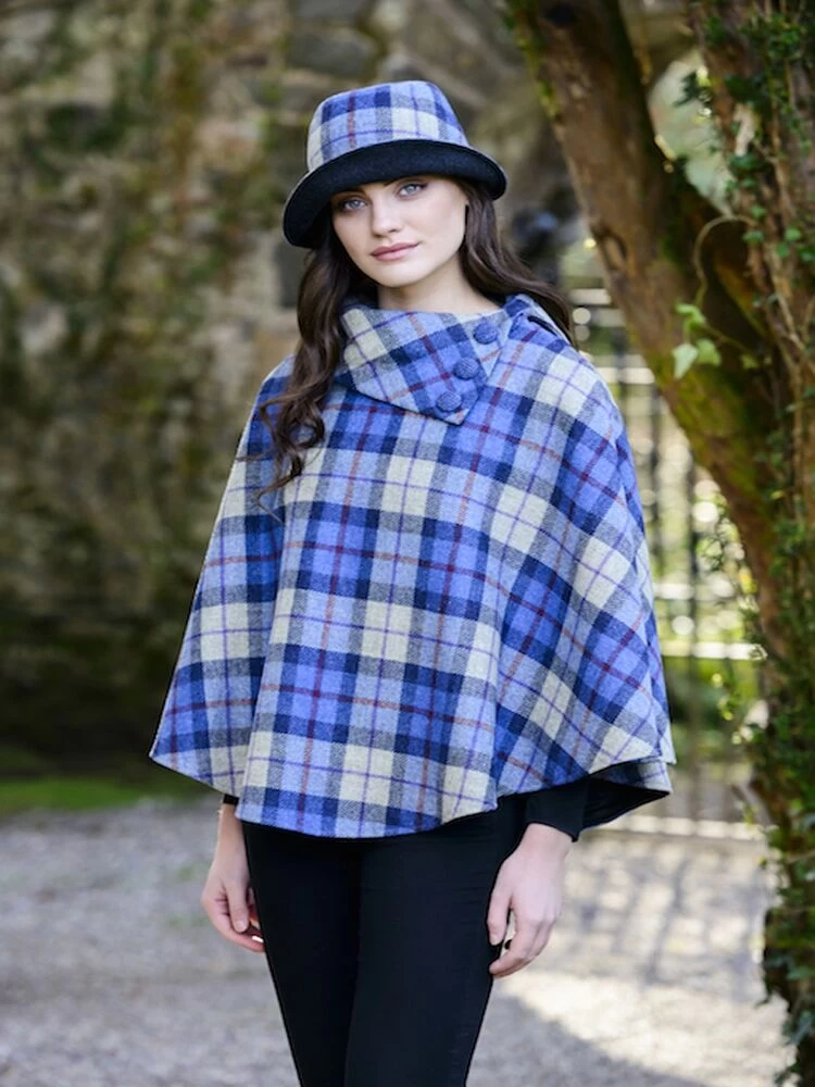 Made in Ireland, this beautiful poncho is made of 100% wool tweed. This one size fits all garment is made in Kerry in Ireland by Mucros Weaver and is an elegant and chic poncho that will not date. The stunning blue check design is a classic style that would go with any outfit. Beautiful button feature on collar.