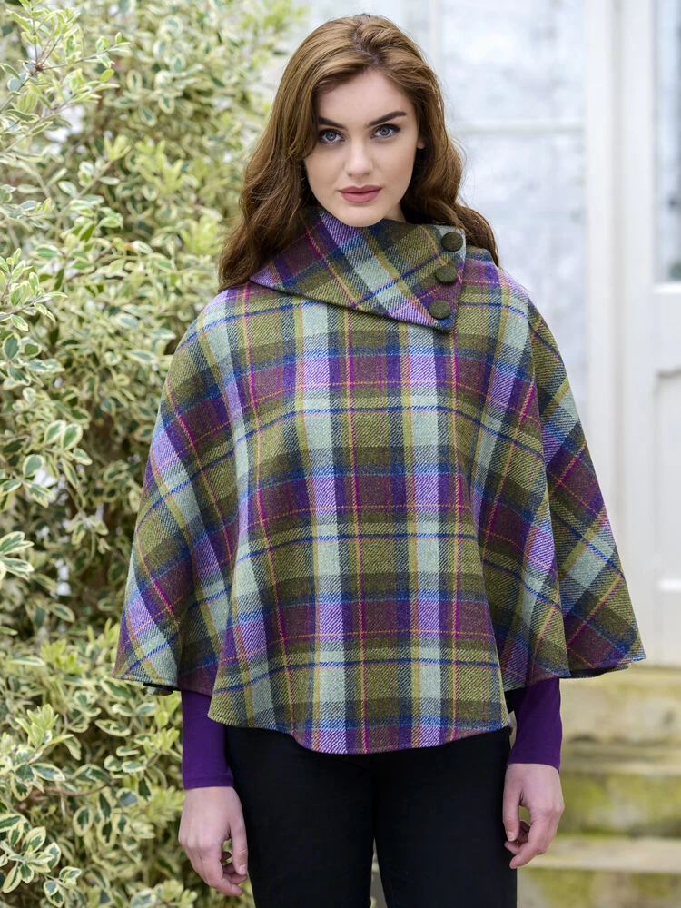 Made in Ireland, this beautiful poncho is made of 100% wool tweed. This one size fits all garment is made in Kerry in Ireland by Mucros Weaver and is an elegant and chic poncho that will not date. Beautiful button feature on collar.