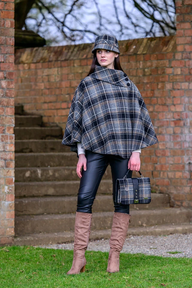 Made in Ireland, this beautiful poncho is made of 100% wool tweed. This one size fits all garment is made in Kerry in Ireland by Mucros Weaver and is an elegant and chic poncho that will not date. Beautiful button feature on collar. This stunning poncho also has matching hats and accessories to acompany it for a stylish look from Ireland.