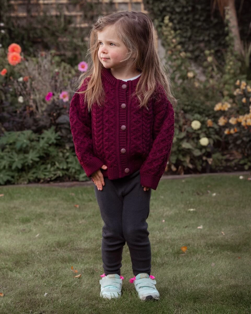 This Irish Aran Cable knit Kids cardigan is made of 100% merino wool. We love the vibrant burgundy colour in this sweater as it brings out the beautiful stitches. It is a fun and vibrant color and perfect for Autumn Winter time. A perfect cardigan for boys or girls!