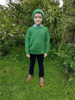 This beautiful bright green Irish aran sweater is made of 100% merino wool. A simply stunning colour for your child this Autumn Winter and can also be worn on St.Patricks Weekend! Gorgeous cable knit stitching in the kiwi green makes this the perfect Irish sweater.