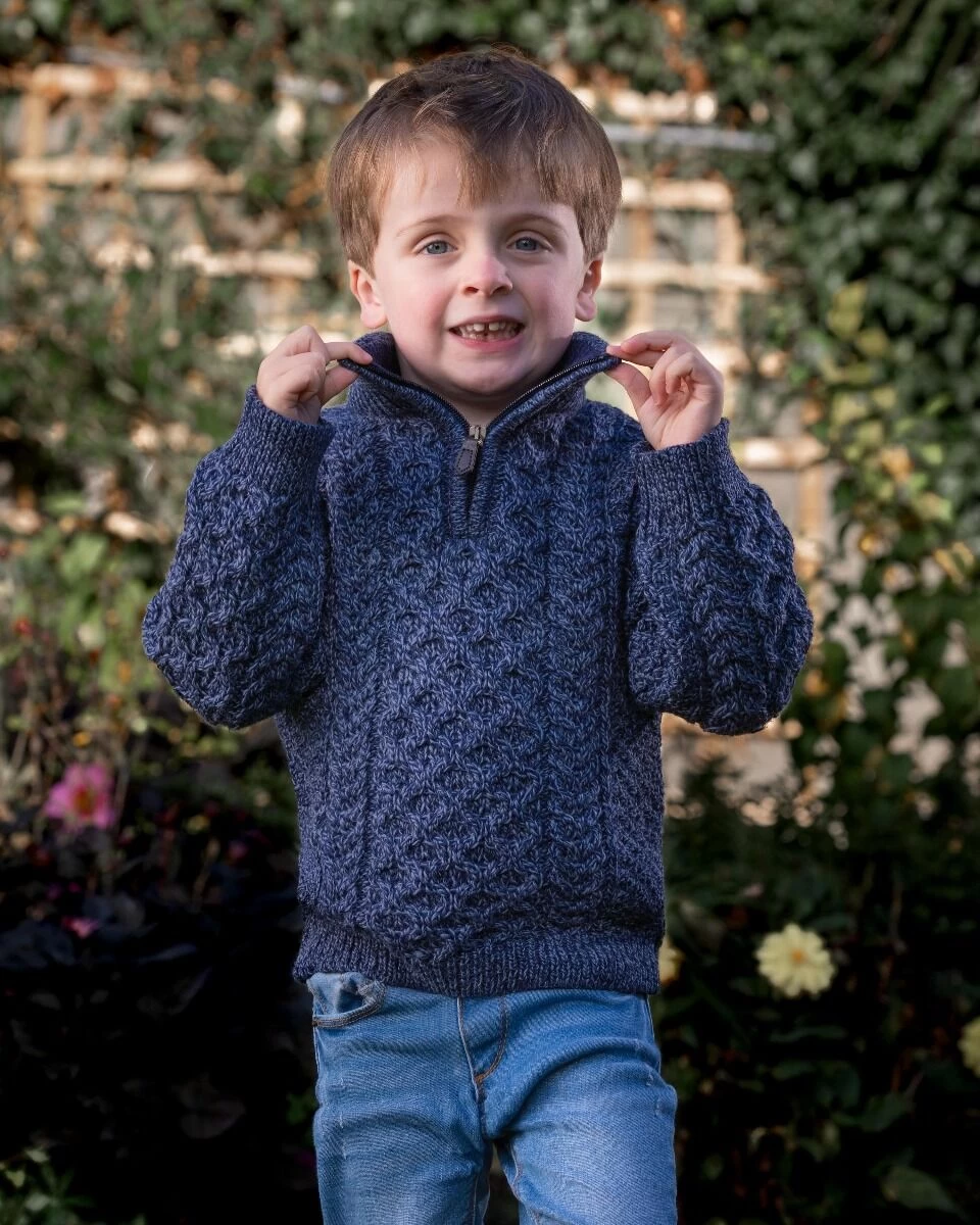 This gorgeous Irish aran kids sweater is made of 100% merino wool. It features a stylish half zip neck which is perfect for any occasion. Dress it up with a shirt underneath or wear over your favorite t- shirt. This Irish Aran half zip is the ultimate addition to your childs wardrobe this year and is perfect for the autumn winter. A gorgeous denim marl knit for your little one.