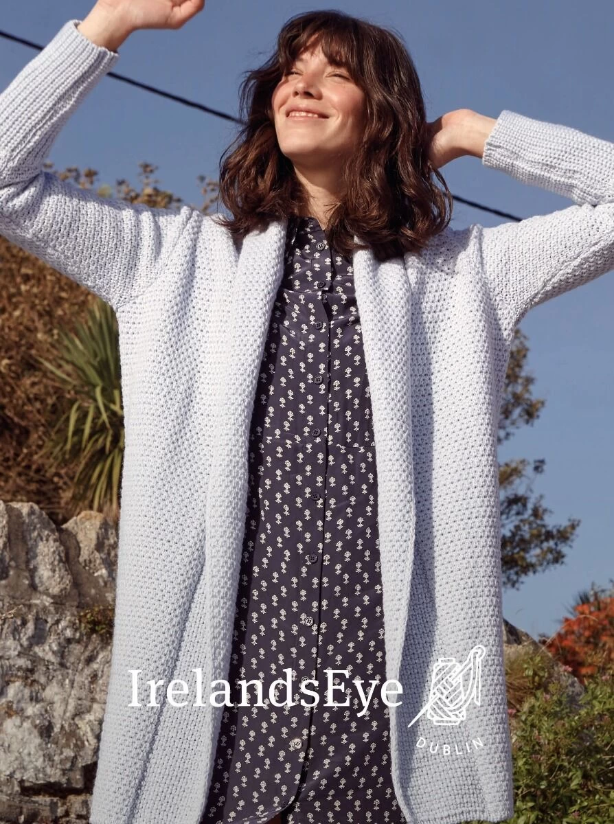 This beautiful textured coatigan is 100% soft merino wool. It is made in Ireland by a family business called Irelands Eye. This beautiful ice blue colour will brighted up any outfit- the perfect colour and style knitwear for spring summer.