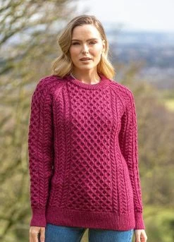 This Irish aran ladies sweater is made of 100% merino wool. It features the beautiful cable knit stitch down the front along with an array of other stunning Irish stitches. We adore this new raspberry colour,it is feminine, elegant and sophisticated. Perfect for wearing with our pink merino wool scarf.