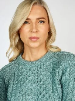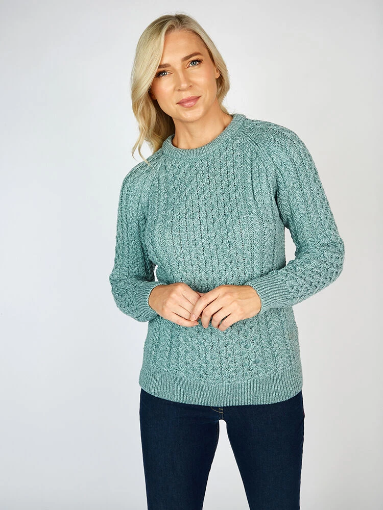 This Irish Aran ladies sweater is made of 100% merino wool. It is the classic cable knit sweater in a stunning Aqua colour which shows the stitches beautifully. Looks amazing with one of our merino wool scarves to complete your look.