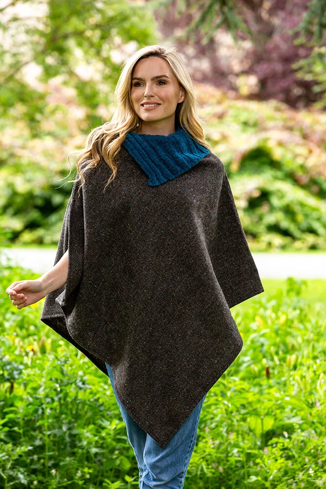 Made in Killarney, Co Kerry. An exceptionally elegant and versatile woven wool tweed poncho with a super soft lambswool collar. This statement piece is made with with super soft lambswool bouclé yarn and features a side slit ensuring easy access. Grey with turquoise collar.