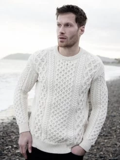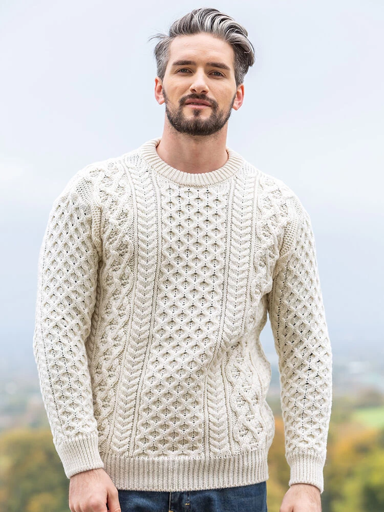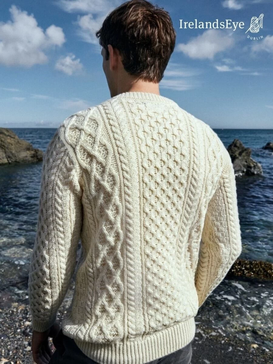 The sweater follows all the traditional Irish Aran stitching patterns that have been passed down from generation to generation, which in older days told stories of families and life in Ireland. Along the centre panel of the body the honeycomb Aran stitch flows, signifying the hard working bee or the hard work of a fisherman, who have been wearing this style for centuries. On either side of this centre panelling there are rows of Irish cable Aran stitches resembling the fisherman’s ropes, the link to life.