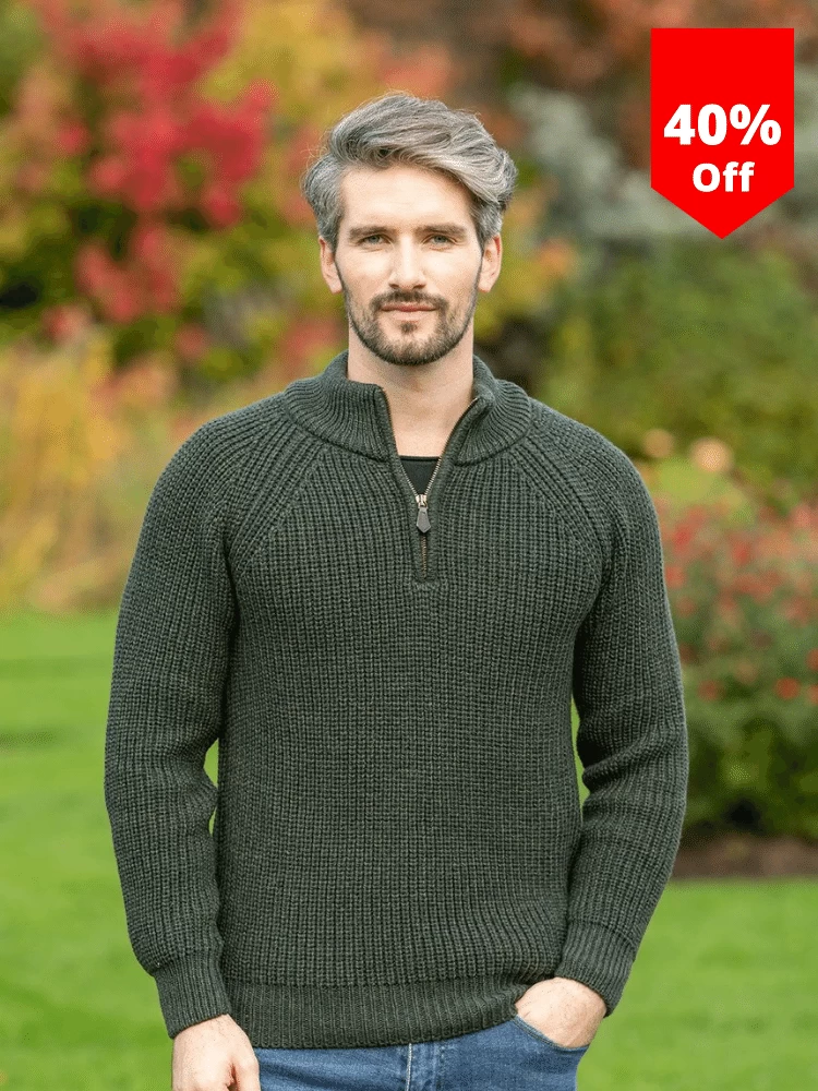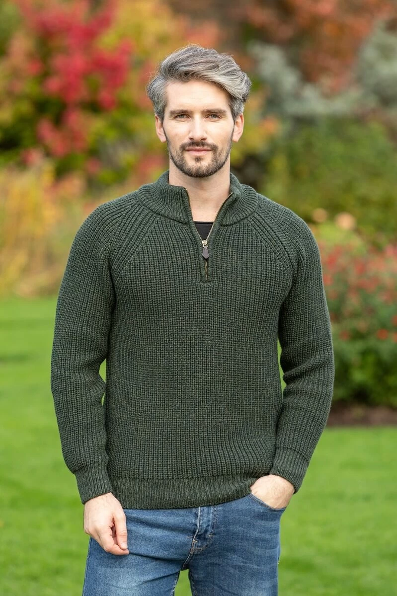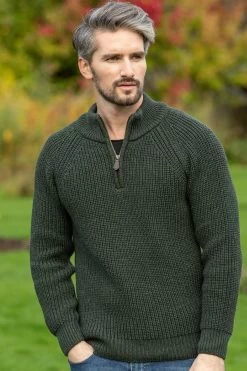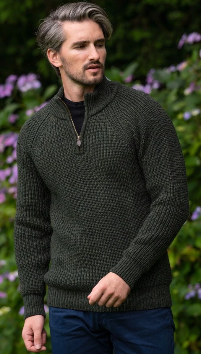 This men’s half zip ribbed sweater Army Green is a classic sweater that has come back into fashion. The army green compliments the sweater and brings out its beautiful stitching. We suggest wearing with one of our soft wool scarves and an irish cap to keep you toasty and stylish this Winter!