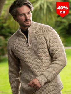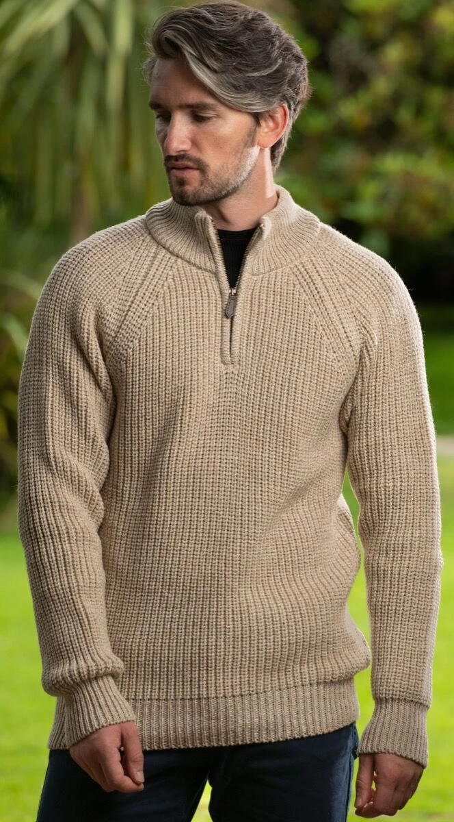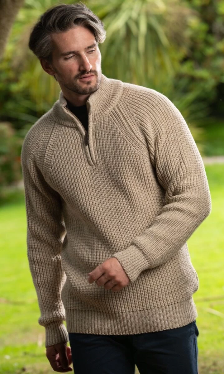 This men’s half zip ribbed sweater Camel is a classic sweater that has come back into fashion. The camel color compliments the sweater and brings out its beautiful stitching. We suggest wearing with one of our soft wool scarves and an irish cap to keep you toasty and stylish this Winter!