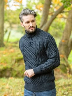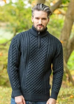 This mens Irish Zip neck sweater is ideal for a man who loves style yet wants to keep warm. It features a gorgeous half zip up feature that one can zip up fully or leave open depending on the desired effect.Made from 100% Irish merino wool, this aran sweater will help keep you warm and snug at all times while showing off your Irish Heritage! Features delicate aran stitching on the front and back of the sweater, it is sure to keep compliments coming!