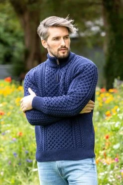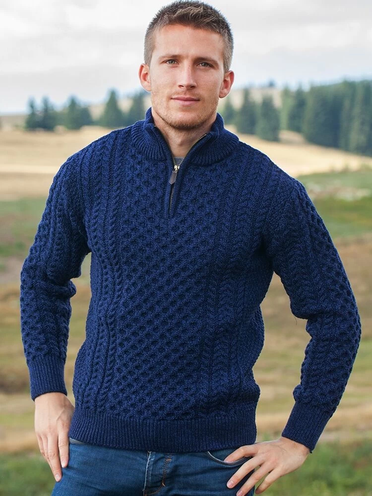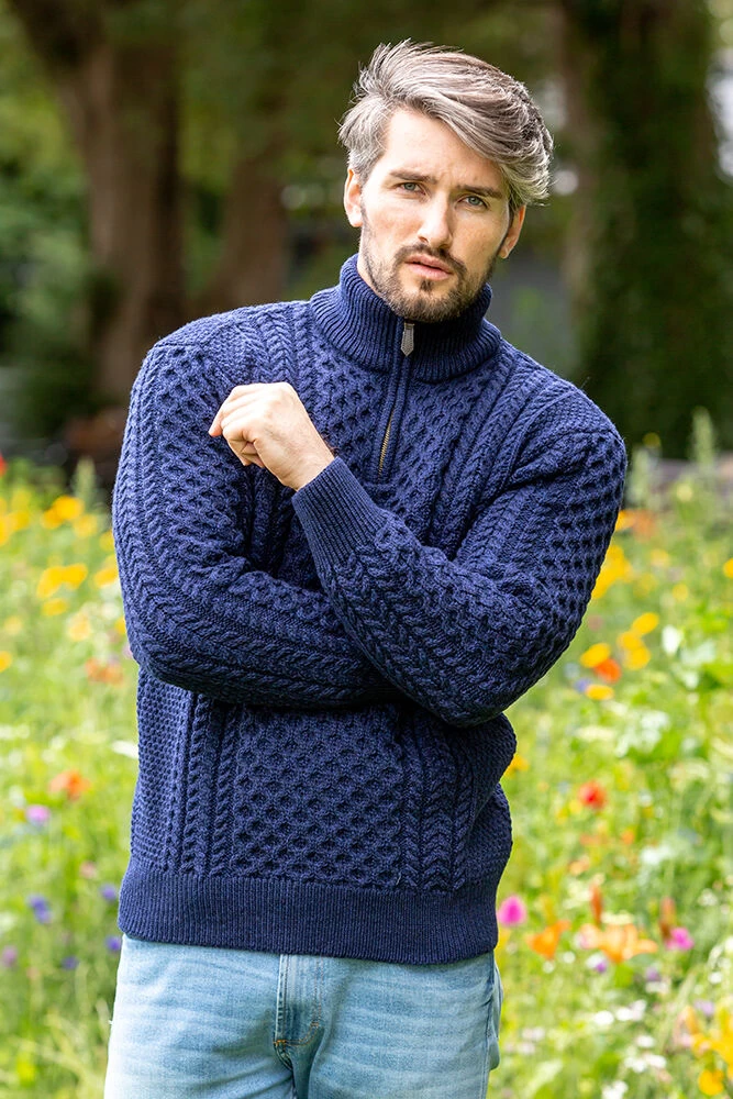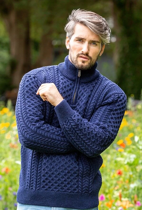 This mens Irish Zip neck sweater is ideal for a man who loves style yet wants to keep warm. It features a gorgeous half zip up feature that one can zip up fully or leave open depending on the desired effect.Made from 100% Irish merino wool, this aran sweater will help keep you warm and snug at all times while showing off your Irish Heritage! Features delicate aran stitching on the front and back of the sweater, it is sure to keep compliments coming!