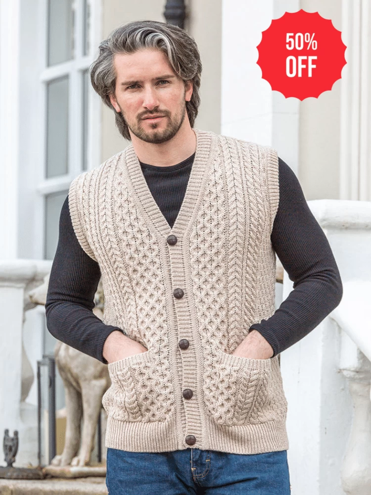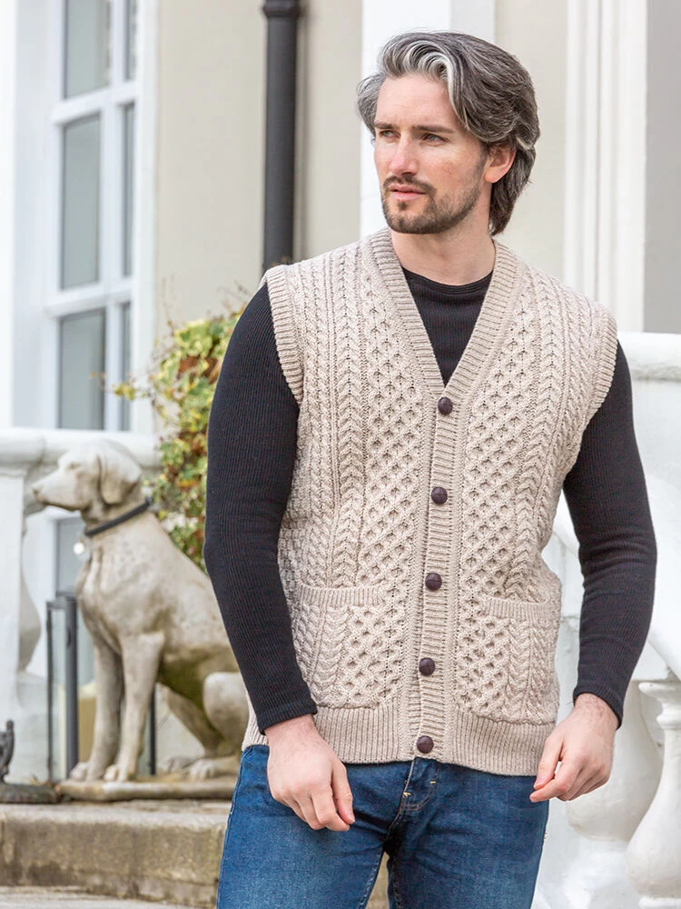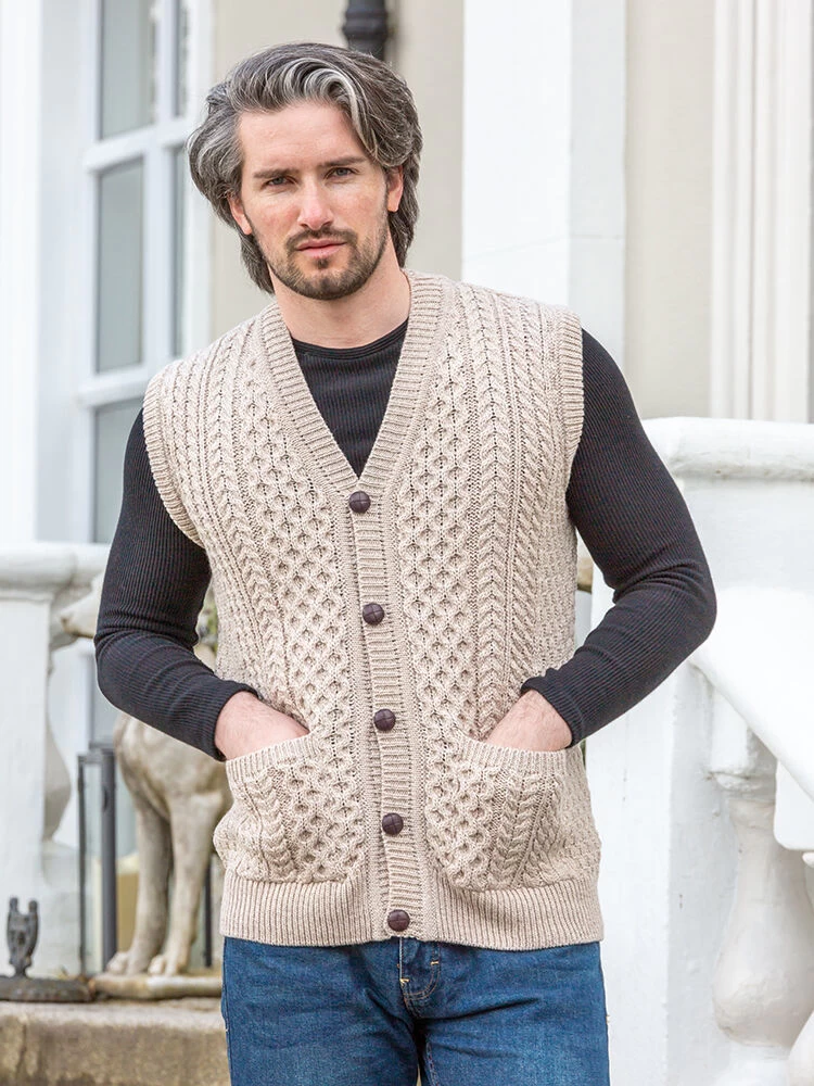 This mens cable knit waistcoat is made of 100% merino wool. It is a stunning shade of beige, making it neutral enough to match with anything in your wardrobe. Ideal for the warmer months ahead over your favourite Grandfather shirt. A must have for any man seeking style and sophistication this year. Model wears size Large.