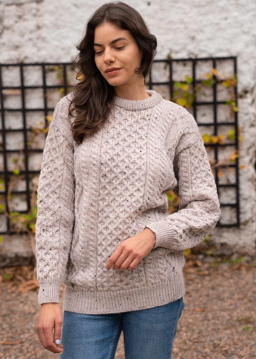 This classic unisex oatmeal Irish crew neck sweater is made in Ireland of 100% merino wool. It follows all the Traditional Irish Aran stitching patterns that have been passed down from generation, which in past told stories of families and life in Ireland. It is a stunning shade of natural, making the stitches really pop.
