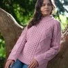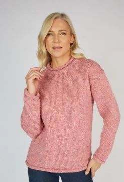 Made in Ireland this handloomed roll neck sweater is one of our best sellers! This ladies sweater is a fitted style with a roll collar, cuff and Basque. A winning style across all sizing. Available in a beautiful shade of light dusty pink yarn with beautiful coloured specks of yarn throughout. Hand loomed in Donegal using 100% Donegal wool. Natural fibres. Sustainably produced. Made in Ireland.