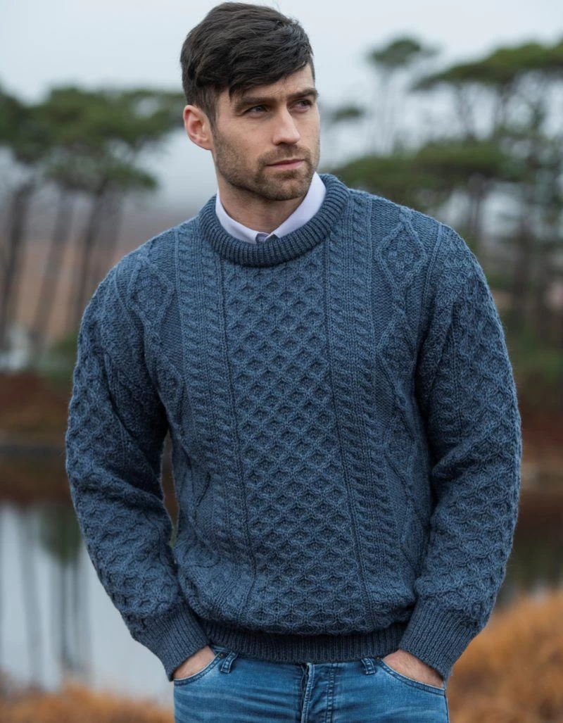 This unisex denim aran sweater is made in Ireland from 100% Pure New Wool.