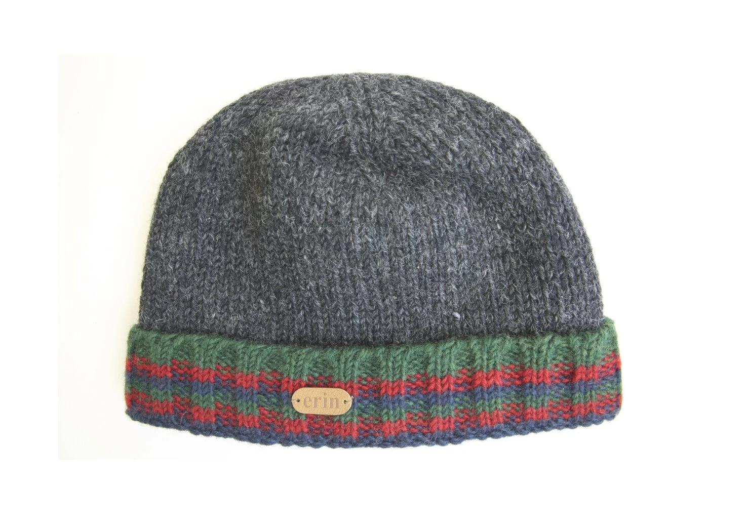 Men’s Turnup Hat in a Charcoal colour with Green stripes.