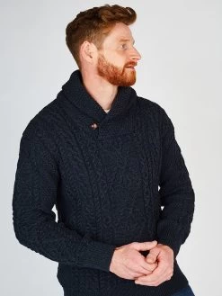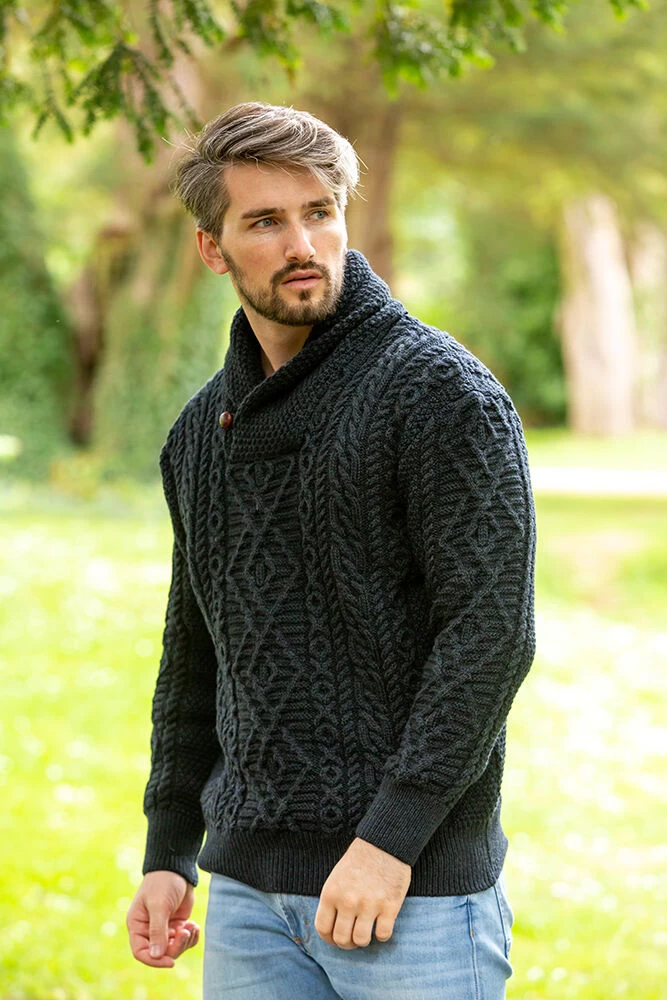 This Irish Aran Shawl Neck Sweater is made of 100% merino wool. It has a stylish shawl neck to give your neck warm and toasty. Featuring an array of intricate Irish stitches, this is an Irish sweater with a difference – the colour Blackwatch which is a beautiful mix of navy and green – makes this a stand out piece. Wear with one of our merino wool scarves to complete the look.