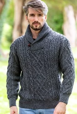 This Mens Irish Aran Shawl Neck is made of 100% merino wool. It has an array of Irish stitches throughout and is super stylish, trendy and warm. The Shawl neck collars adds warmth around your neck so you wont feel the cold in this gorgeous Irish sweater. Team with one of our cashmere scarves to complete the look.