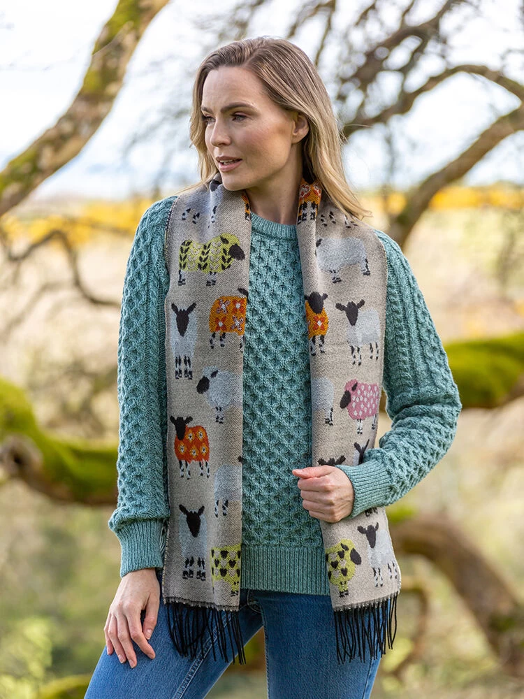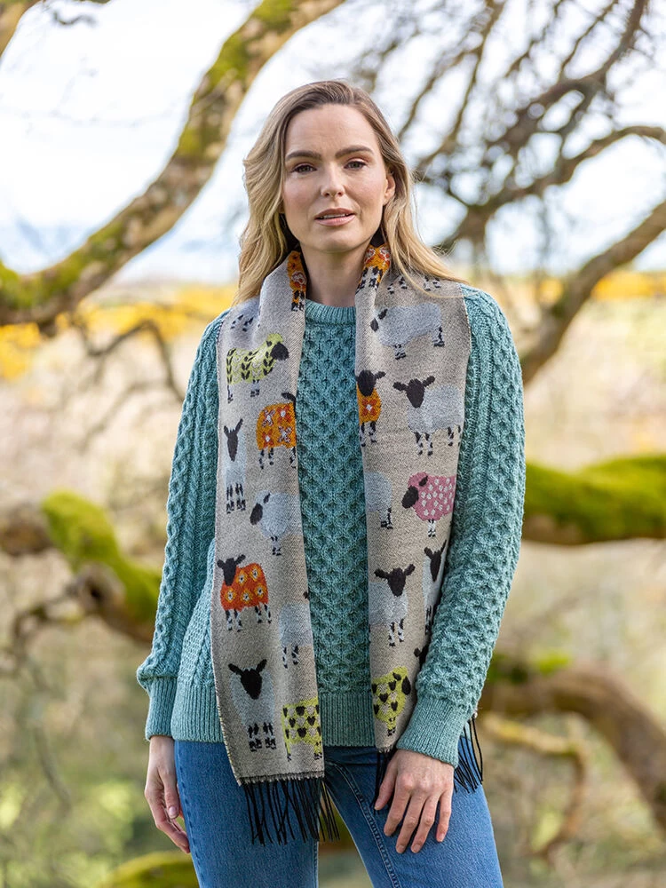 Celebrate your Irish roots with this beautiful sheep motif scarf in beige – neutral beige tones that will match any outfit this sheep scarf is a perfect spring accessory.